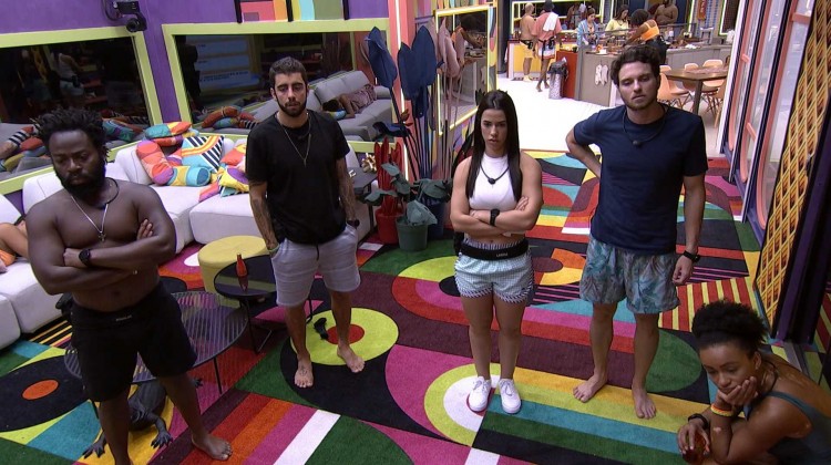 “Tomei uma cara feia, um coração partido...”, enumera Pedro Scooby enquanto assiste o resultado do Queridômetro do dia no telão da sala e é acompanhado por Douglas, Larissa e Paulo André.
