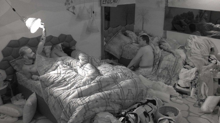 Fred, que está deitado na cama em frente, pega o abajur e ilumina o cômodo em direção ao casal. Ele canta uma música com a letra modificada, brincando com os dois: "Bota, bota a mão no chão, o Fop vai te dar catucadão". "Ali, eles nem estão aparecendo mais", continua Fred.