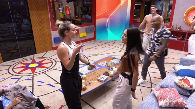 Os brothers ao redor caem na gargalhada e Bruna até faz algumas perguntas "polêmicas" para o brother. "Qual o seu signo?" e "Em quem você votou?", foram algumas dúvidas dela.