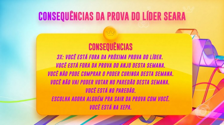 Durante o programa ao vivo desta quinta-feira, 16/2, Tadeu Schmidt explicou como funcionará a dinâmica: "Os primeiros nove jogadores que deixarem a prova vão sortear cada um uma consequência", anunciou o apresentador.