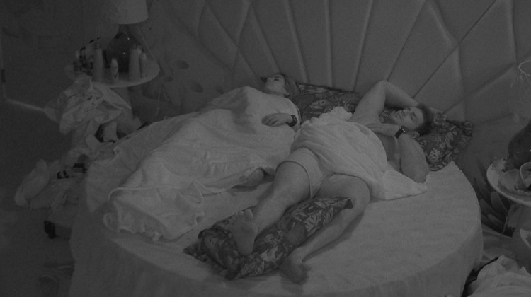 O fazendeiro acorda e olha para a jogadora de vôlei, que está deitada no lado esquerdo da cama. O brother vira o rosto e volta a dormir.