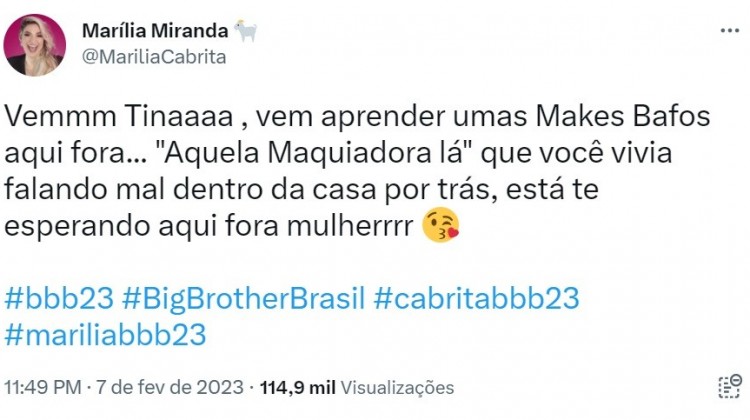 "Vemmm Tinaaaa , vem aprender umas Makes Bafos aqui fora... 'Aquela Maquiadora lá' que você vivia falando mal dentro da casa por trás, está te esperando aqui fora mulherrrr 😘", publicou Marília.