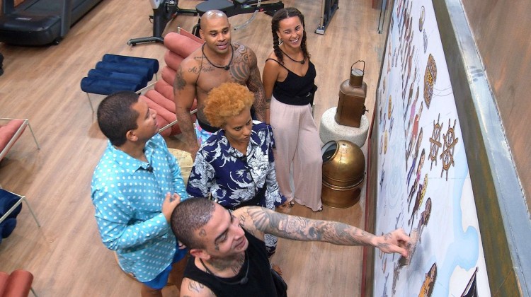 Na casa do BBB 23, participantes já eliminados da Prova da Imunidade entram na academia para conhecer o painel tático. As duplas Aline e Bruno, Cezar e Domitila e Guimé e Tina elogiam as artes e tentam deduzir quais são os brothers e sisters representados.