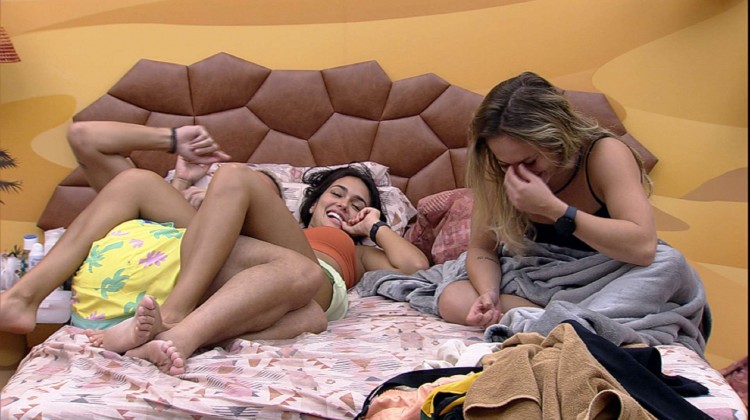 Bruna também explica: "É que você sempre tem uma história pra compartilhar e ele também!" e Sapato rebate em meio às gargalhadas: "a que vocês nunca deixam eu contar? É essa? Vai pra p*, vocês!"